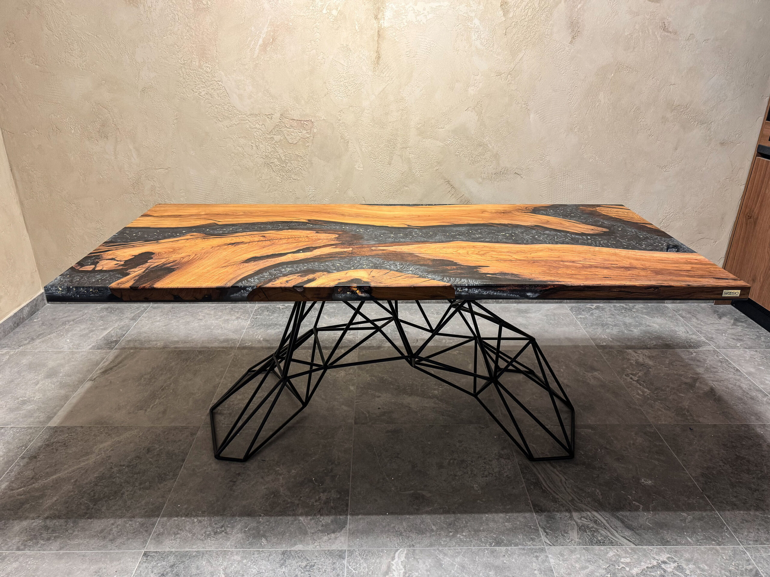 Izrađen od iznimno rijetkog drva badema, čija bogata tekstura i topli tonovi dolaze do izražaja u kontrastu s dubokom, reflektirajućom epoxy smolom. U strukturi smole diskretno su utisnuti 24-karatni zlatni listići, koji dodatno naglašavaju luksuzni karakter ovog komada.